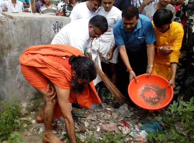 सफाई अभियान के तहत बाबा रामदेव ने खुद सफाई का बीड़ा उठाया और लोगों को स्वच्छता अभियान चलाने और अपने घर के आसपास सहित गंगा घाटों को साफ रखने का आह्वान किया।