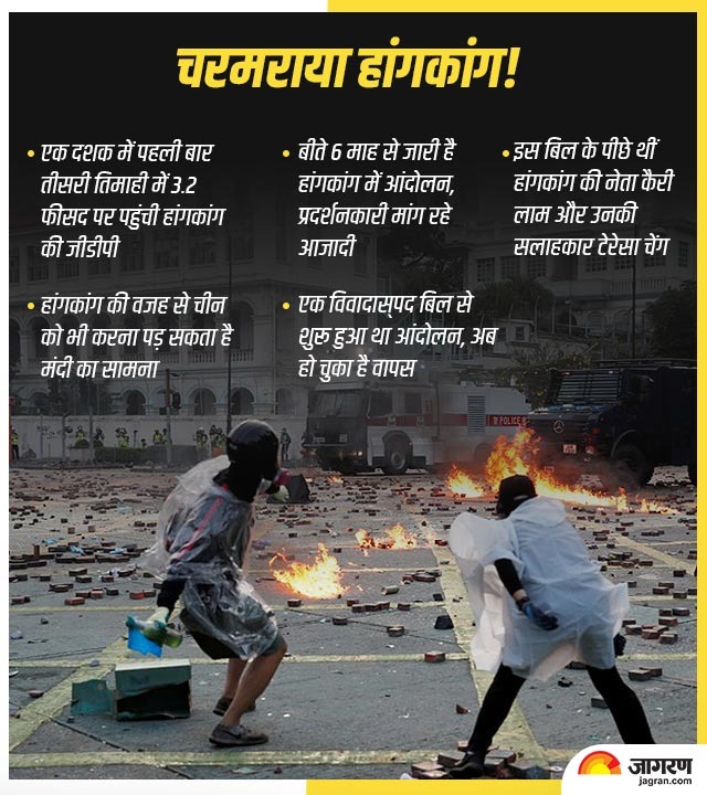 हांगकांग में छह माह से जारी आंदोलन की वजह से चीन की हालत खराब हो रही है। वहीं हांगकांग की अर्थव्यवस्था में जबरदस्त गिरावट आई है।