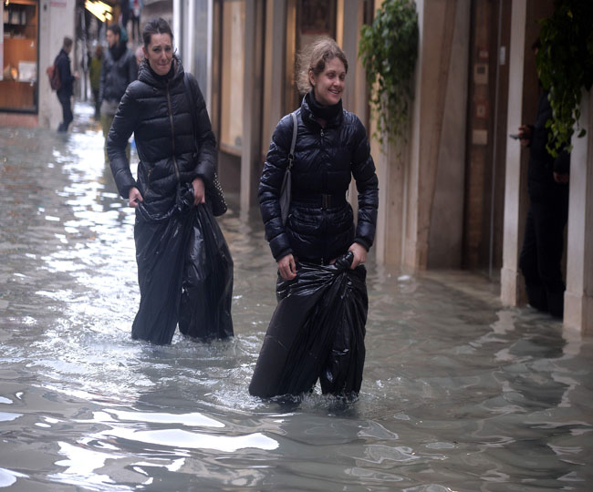 वेनिस में भले ही बाढ़ का पानी भरा है लेकिन, यहां के लोगों के चेहरे की हंसी बताती है कि सब कुछ ठीक है। आपको बता दें कि यह वेनिस के इतिहास की सबसे जबरदस्त बाढ़ है। लेकिन, इसका भी यहां के लोग पूरा मजा ले रहे हैं।
