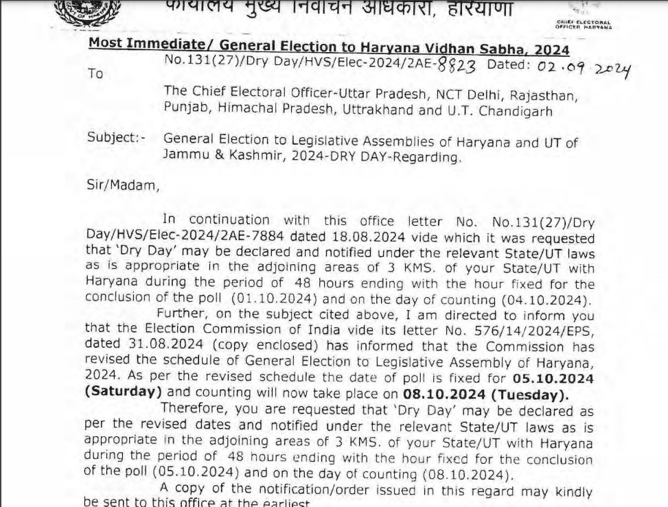 बता दें कि अन्य राज्यों में हरियाणा की सीमा से तीन किलोमीटर के दायरे में आने वाली दुकानें बंद रहेंगीं। दुकानें गुरुवार शाम से लेकर शनिवार शाम तक बंद रहेंगीं। इसके बाद आठ अक्टूबर को वोटिंग वाले दिन भी इन इलाकों में शराब बिक्री पर पाबंदी रहेगी।
