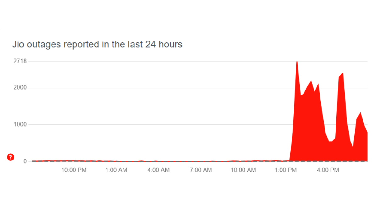 रियल-टाइम आउटेज को ट्रैक करने वाले प्लेटफॉर्म डाउनडिटेक्टर ने अपनी रिपोर्ट में बताया कि 2,400 से ज्यादा यूजर को अपने जियो कनेक्शन में समस्या का सामना करना पड़ रहा था।