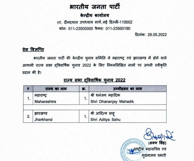 राज्यसभा चुनाव : आदित्य साहू होंगे भाजपा के उम्मीदवार