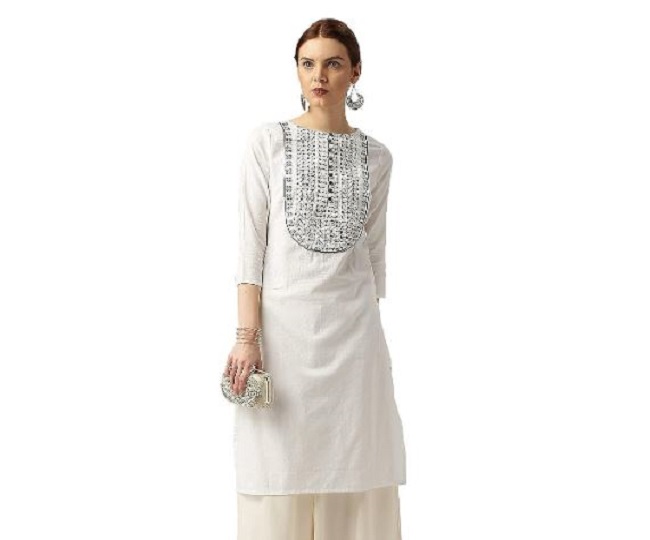 ए लाइन यह व्हाइट कुर्ती पर Amazon Offers 2023 में 81% की काफी अच्छी दी जा रही है। इसमें राउंड शेप का नेक दिया गया है और कुर्ती के फ्रंट पर चिकन कारी वर्क से डिजाइन किया गया है।