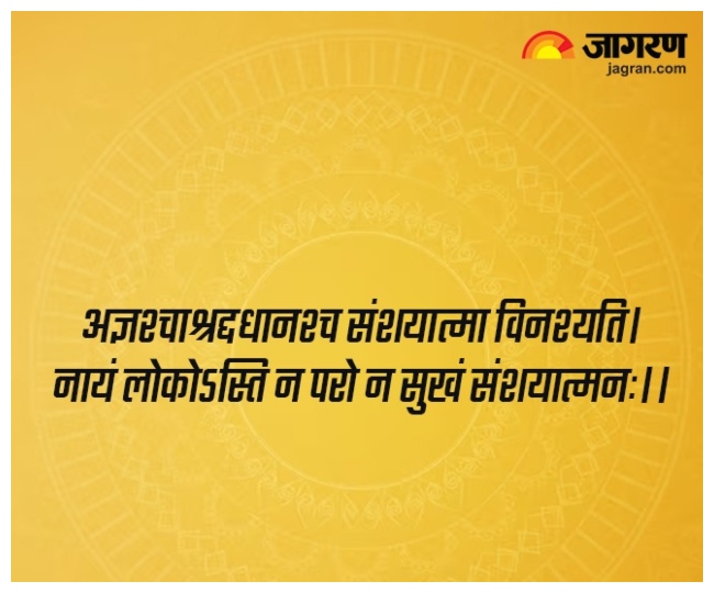 भगवद गीता के चतुर्थ अध्याय के 40वें श्लोक में भगवान श्री कृष्ण अर्जुन से संवाद करते हुए कहते हैं कि जो व्यक्ति विवेकहीन और श्रद्धा रहित होता है उसका पतन हो जाता है। ऐसे संशयात्मा मनुष्य के लिए न यह लोक है, न परलोक है और न सुख ही है।