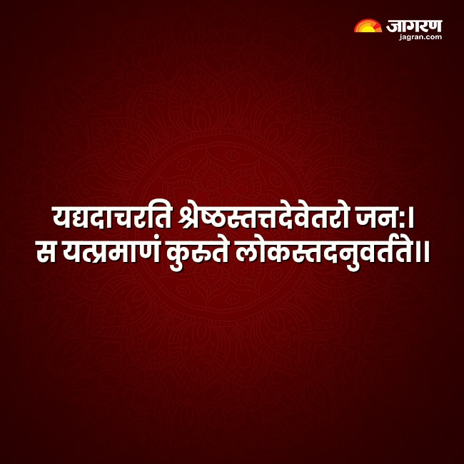 अर्थ - गीता के इस श्लोक में भगवान श्री कृष्ण अर्जुन से कहते हैं कि ''एक श्रेष्ठ पुरुष अच्छे कार्य करता है, जिसे देखकर अन्य लोग भी सीखते हैं। साथ ही इसका असर सम्पूर्ण मानव समाज पर पड़ता है।''