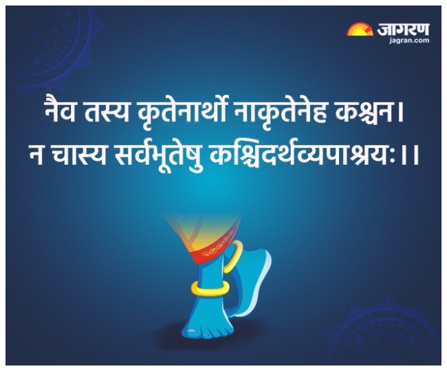 भगवद गीता के तीसरे अध्याय के 18 वें श्लोक में भगवान श्री कृष्ण अर्जुन से कहते हैं कि कर्मयोग से सिद्ध हुए महापुरुष का इस संसार में न तो कर्म करने से कोई प्रयोजन रहता है, और न ही कर्म न करने से कोई हानि होती है। उस महापुरुष का सम्पूर्ण प्राणियों में कोई भी स्वार्थ का सम्बन्ध नहीं रहता।