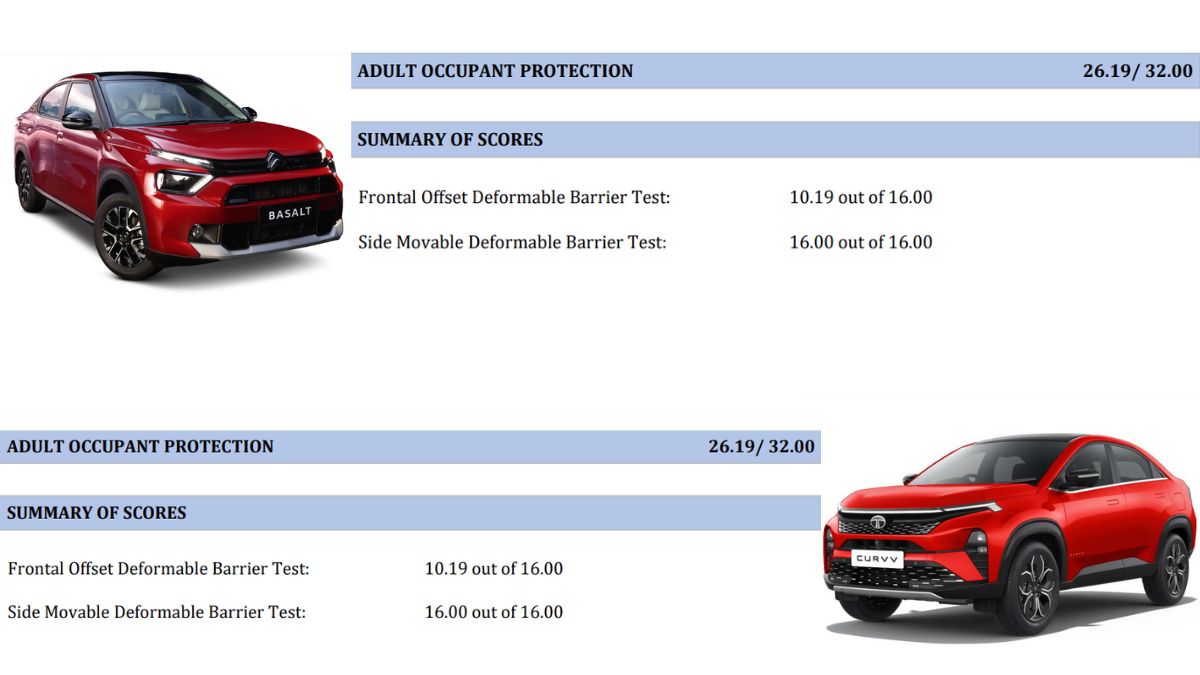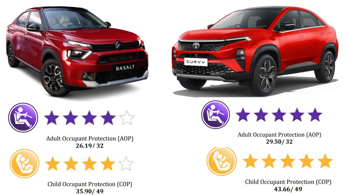 टाटा की ओर से कूप एसयूवी के तौर पर कुछ समय पहले ही लॉन्च की गई Tata Curvv को Crash Test में पूरे पांच अंक हासिल हुए हैं। इस एसयूवी को व्यस्कों के साथ ही बच्चों की सुरक्षा के लिए भी पूरी 5स्टार रेटिंग मिली है। Bharat NCAP ने 15 October को ही इसके Crash Test के नतीजों को सार्वजनिक किया है। वहीं Citroen Basalt के भी Crash Test के नतीजों को सार्वजनिक 10-11 October के बीच किया गया था। जिसमें सिट्रॉएन की कूप एसयूवी को 4स्टार सेफ्टी रेटिंग मिली है।