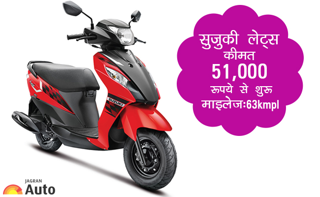 लेट्स एक स्टाइलिश एक स्कूटर है। दिल्ली में इसकी एक्स शो रूम कीमत 51 हजार और 52 हजार रूपये रखी गयी है। गर्ल्स को लुभाने के लिए इसमें कई अच्छे फीचर्स कोम शामिल किया गया है। ड्यूल कलर्स में होने से यह ज्यादा आकर्षित नज़र आता है। इसमें 112.8 cc का इंजन लगा है और एक लीटर में यह 63 किलोमीटर की माइलेज निकाल देता है। आरामदायक राइड इसकी खासियत है।