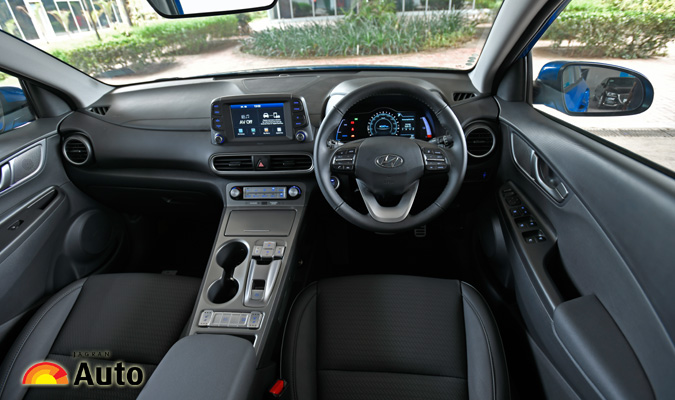 Hyundai Kona EV के एक्सटीरियर में जिस तरह से यूनीक फीचर्स मौजूद हैं, वैसे ही Kona EV के इंटीरियर में भी काफी सारे यूनीक और लग्जरी फीचर्स मिलते हैं। ड्राइवर सीट पर बैठते ही आपको Kona किसी हाईटेक कार से कम नहीं लगेगी। डैशबोर्ड पर प्लास्टि के साथ प्रीमियम सॉफ्ट टच पैड का भी इस्तेमाल किया है। इसके अलावा कंपनी ने सीटों पर अच्छी ग्रेड वाले लैदर का इस्तेमाल किया है, जो वेंटिलेटेड हैं। स्टीयरिंग पर भी लैदर चढ़ा हुआ है।