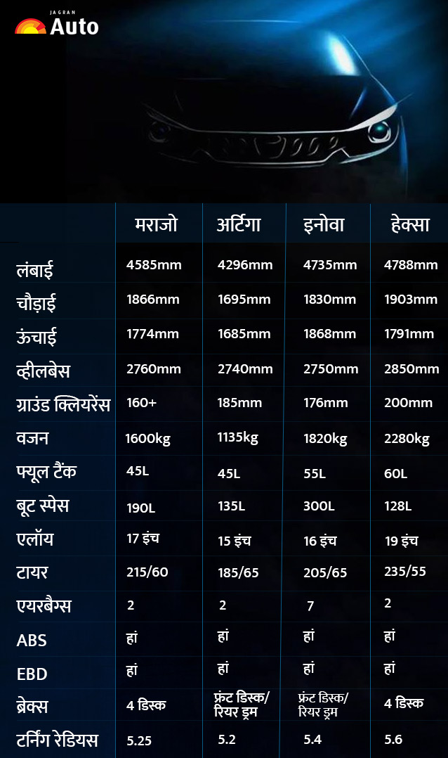 MPV सेगमेंट में महिंद्रा मराजो की एंट्री के चलते त्योहारी सीजन के दौरान फैमिली कार खरीदने जा रहे ग्राहक अब उलझन में पड़ गए हैं। ग्राहकों के मन में यही बात आ रही है कि आखिर कौनसी MPV खरीदी जाए। बता दें, भारतीय बजार में महिंद्रा मराजो का मुकाबला मारुति सुजुकी अर्टिगा, टोयोटा इनोवा क्रिस्टा और टाटा हेक्सा से है। ग्राहकों के पास एक अच्छी फैमिली कार खरीदने के लिए यही चार विकल्प बचे हुए हैं। आज हम आपको अपनी इस खबर में इन्हीं कारों की तुलना एक दूसरे से करने जा रहे हैं, जिससे आपको यह समझने में आसानी होगी कि आपको कौन-सी कार खरीदनी चाहिए।