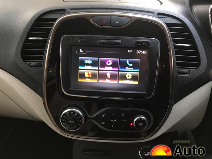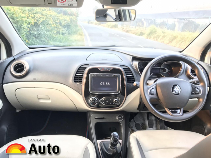 कैप्चर का इंटीरियर आपने पहले किसी रेनो गाड़ी में नहीं देखा होगा, यह डुअल टोन कलर - ब्लैक और व्हाइट में आता है, इसका डैशबोर्ड लेआउट भी काफी अच्छा है। इसमें 7 इंच का टचस्क्रीन इन्फोटेनमेंट सिस्टम दिया गया है और अगर इसके टच एंड फील की बात करें तो, मैं ये नहीं कहूंगा कि यह काफी अच्छा और प्रीमयम है, यहां यह थोड़ा एवरेज है। इसके अलावा इन्फोटेनमेंट सिस्टम ना तो एंड्रॉइड ऑटो के साथ आता है और ना हीं एप्पल कारप्ले और मिरर लिंक के साथ। ये वही टचस्क्रीन है जो आपने सभी रेनो गाड़ियों में देखा होगा। इस मामले में रेनो को अपडेट होने की जरूरत है।