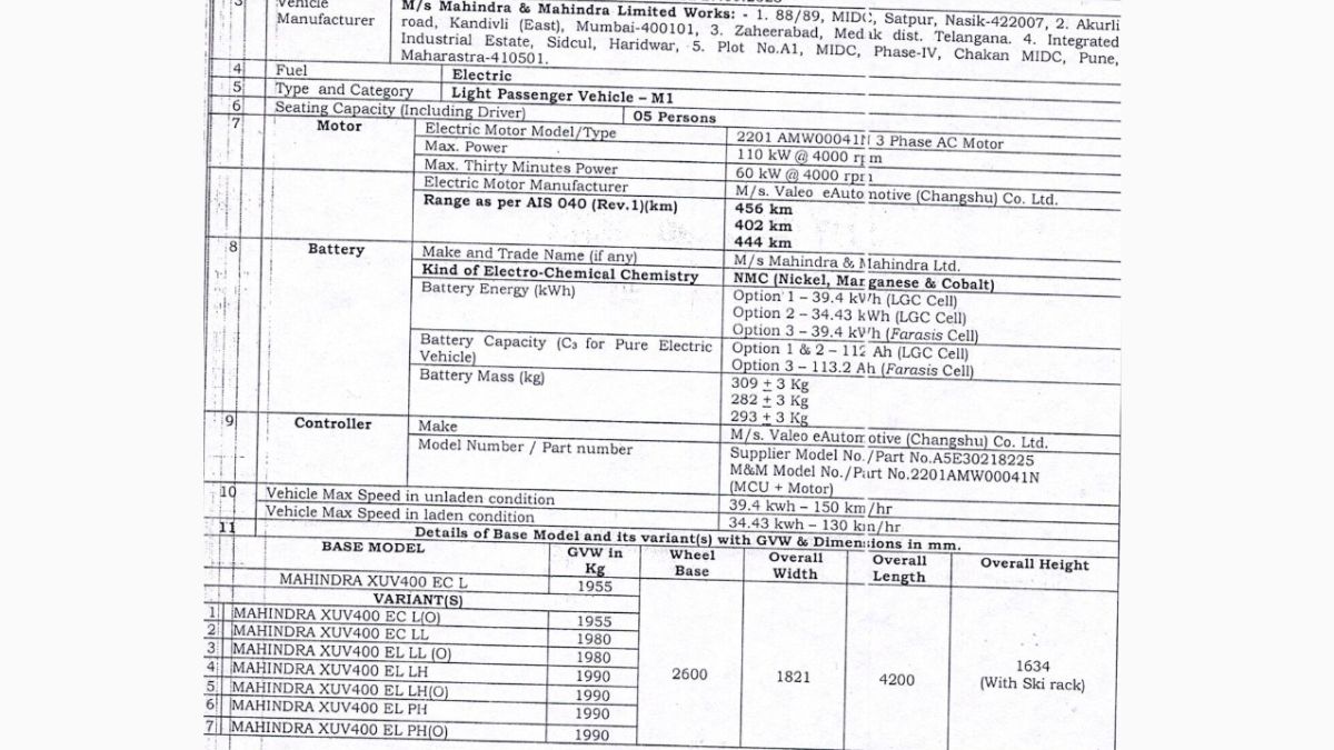 महिंद्रा की ओर से XUV 3XO को लॉन्च करने के बाद अब जल्द ही XUV 400 EV के Facelift वर्जन को भी कंपनी की ओर से पेश किया जा सकता है। रिपोर्ट्स के मुताबिक कंपनी की ओर से इसके लिए होमोलॉगेशन दस्तावेज की जानकारी सामने आई है। जिसमें इसके और वेरिएंट्स को भी लाने की जानकारी मिल रही है।