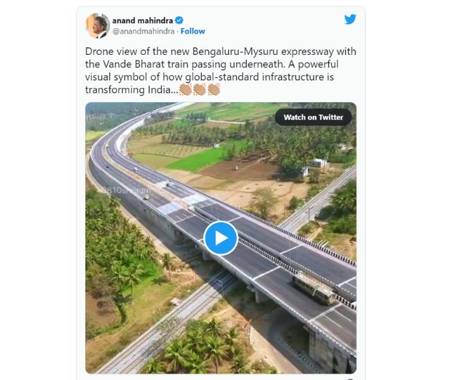 आनंद महिंद्रा ने अपने ट्विटर अकाउंट से वीडियो साझा करते हुए एक ड्रोन से ली गई तस्वीर दिखाई है। इस तस्वीर की खासियत है कि इसमें ऊपर से बेंगलुरु-मैसूर एक्सप्रेस-वे है और इसके नीचे से "वंदे भारत ट्रेन को क्रॉस करते दिखाया गया है। इसके साथ ही उन्होंने लिखा है, "वैश्विक स्तर का बुनियादी ढांचा भारत को कैसे बदल रहा है इसका एक शक्तिशाली प्रतीक ...।"