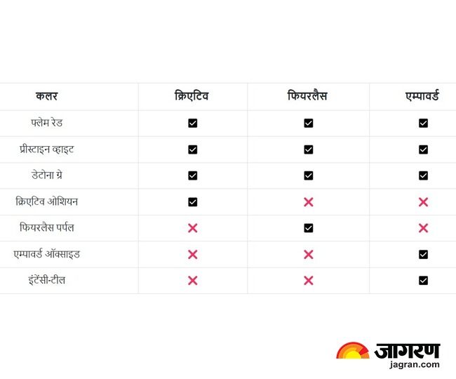 Creative+, Fearless, Fearless+, Fearless+ S, Empowered वेरिएंट में आती है। आप इस तस्वीर के जरिये समझ सकते हैं कि कौन से वेरिएंट में कौन सा कलर ऑप्शन उपलब्ध है।