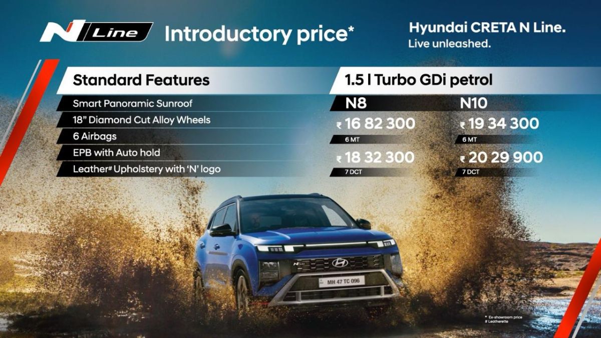 Hyundai Creta N Line को N8 और N10 वेरिएंट में पेश किया गया है और ये एक इंजन व दो ट्रांसमिशन विकल्पों के साथ उपलब्ध है। N8 वेरिएंट की कीमत ₹16.82 लाख से ₹18.32 लाख (एक्स-शोरूम) के बीच है, वहीं टॉप-एंड N10 वेरिएंट की कीमत मैनुअल के लिए ₹19.34 लाख और ऑटोमैटिक वर्जन के लिए ₹20.30 लाख (एक्स-शोरूम) होगी।