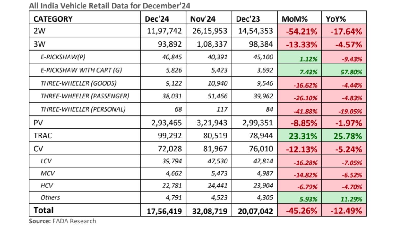 December 2024 Indian vehicle sales फेडरेशन ऑफ ऑटोमोबाइल डीलर्स एसोसिएशन (FADA) की ओर से वाहनों की बिक्री को लेकर रिपोर्ट जारी की गई है। रिपोर्ट के मुताबिक December 2024 में देशभर में कितने वाहनों की बिक्री की गई है। मंथ ऑन मंथ बेसिस पर और ईयर ऑन ईयर बेसिस पर किस सेगमेंट में कैसी बिक्री Vehicle Sales रही है। आइए जानते हैं।