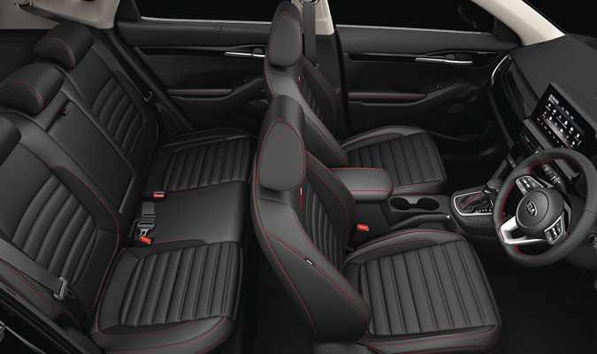इंटीरियर - रियर AC वेंट्स, LED मूड साउंट लाइटिंग, फ्रंट सीटबेल्ट हाइट एडजस्टर, लैदर अपहोलस्ट्री, 60:40 स्पिल्ट फोल्डिंग रियर सीट्स, 32-डिग्री तक रियर सीट रिक्लाइन, रियर सनशेड कर्टेन