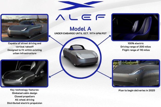 कंपनी का दावा है कि Alef मॉडल ए फ्लाइंग कार में वर्टिकल टेकऑफ और लैंडिंग क्षमताएं हैं। Alef फ्लाइंग कार सड़क पर 322 किमी (200 मील) की रेंज और 177 किमी (110 मील) की फ्लाइंग रेंज देगी।