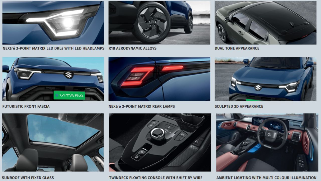 Maruti E Vitara के फ्रंट में पॉलीहाइड्रल मस्क्यूलर स्टांस, थ्री पाइंट मैट्रिक्स एलईडी डीआरएल, थ्री पाइंट मैट्रिक्स रियर लाइट्स, एंबिएंट लाइट्स, 26.04 सेमी एमआईडी, ट्विनडैक फ्लोटिंग कंसोल के साथ शिफ्ट बाय वायर, फिक्स्ड ग्लास के साथ सनरूफ, वायरलेस चार्जर, नेक्स्ट जेन सुजुकी कनेक्ट, फ्रंट वेंटिलेटिड सीट्स, 10वे पावर एडजस्टेबल ड्राइवर सीट, स्लाइडिंग और रिक्लाइनिंग रियर सीट्स, पीएम 2.5 केबिन एयर फिल्टर, फलैक्सिबल बूट स्पेस, लॉन्ग व्हील बेस, सात एयरबैग, हाई टेंसाइल स्टील स्ट्रैंथ, टीपीएमएस, 360 डिग्री कैमरा, फ्रंट और रियर पार्किंग सेंसर, ईपीबी, ब्रेक होल्ड, Level-2 ADAS, ड्राइविंग मोड्स, रीजन और स्नो मोड्स, 5.2 मीटर टर्निंग रेडियस, 18 इंच अलॉय व्हील्स, रूफ एंड स्पॉयलर, ड्यूल टोन इंटीरियर, 25.65 सेमी इंफोटेनमेंट सिस्टम, हरमन ऑडियो सिस्टम, एबीएस, ईबीडी, हिल असिस्ट जैसे कई फीचर्स को दिया जाएगा।