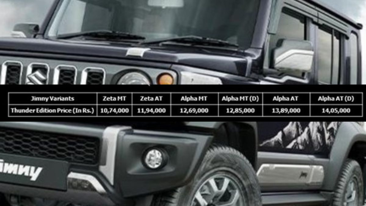 ऑटो डेस्क, नई दिल्ली। Maruti Suzuki ने भारतीय बाजार में चुपके से Jimny का एक स्पेशल एडिशन लॉन्च किया है। कंपनी ने इसे Thunder Edition नाम दिया है और ये Zeta व Alpha दोनों वेरिएंट के साथ उपलब्ध है। jimny थंडर एडिशन की कीमत 10.74 लाख रुपये से शुरू होकर 14.05 लाख रुपये तक जाती है। ये दोनों कीमतें एक्स-शोरूम हैं। आइए, इसके बारे में जान लेते हैं।