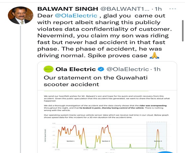 इसके बाद 11 अप्रैल को ओला ने स्कूटर को रिपेयर के लिए टो किया और मामले की जांच की। ओला के कार्यकारी चंदन कुमार ने मामले को समझने के लिए फोन किया लेकिन उसके बाद से उन्हें कोई अपडेट नहीं मिला है। बलवंत सिंह ओला की कानूनी टीम से बात करना चाहते थे लेकिन उन्होंने अभी तक वरिष्ठ प्रबंधन से किसी से बात नहीं की है।
