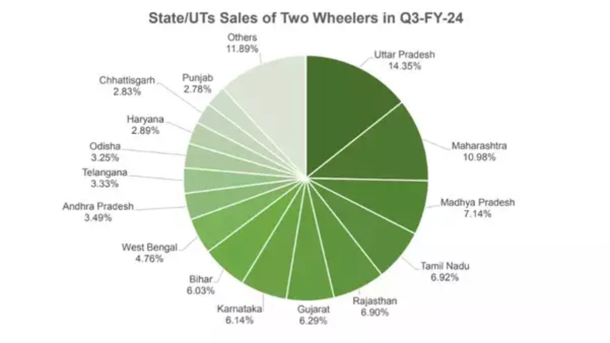 दोपहिया वाहन सेगमेंट में बिक्री में 14.35 प्रतिशत हिस्सेदारी के साथ उत्तर प्रदेश का दबदबा रहा है। महाराष्ट्र 10.98 प्रतिशत बाजार हिस्सेदारी के साथ दूसरे स्थान पर रहा, जबकि मध्य प्रदेश (एमपी) ने बाजार में 7.14 प्रतिशत हिस्सेदारी के साथ तीसरा स्थान हासिल किया है।