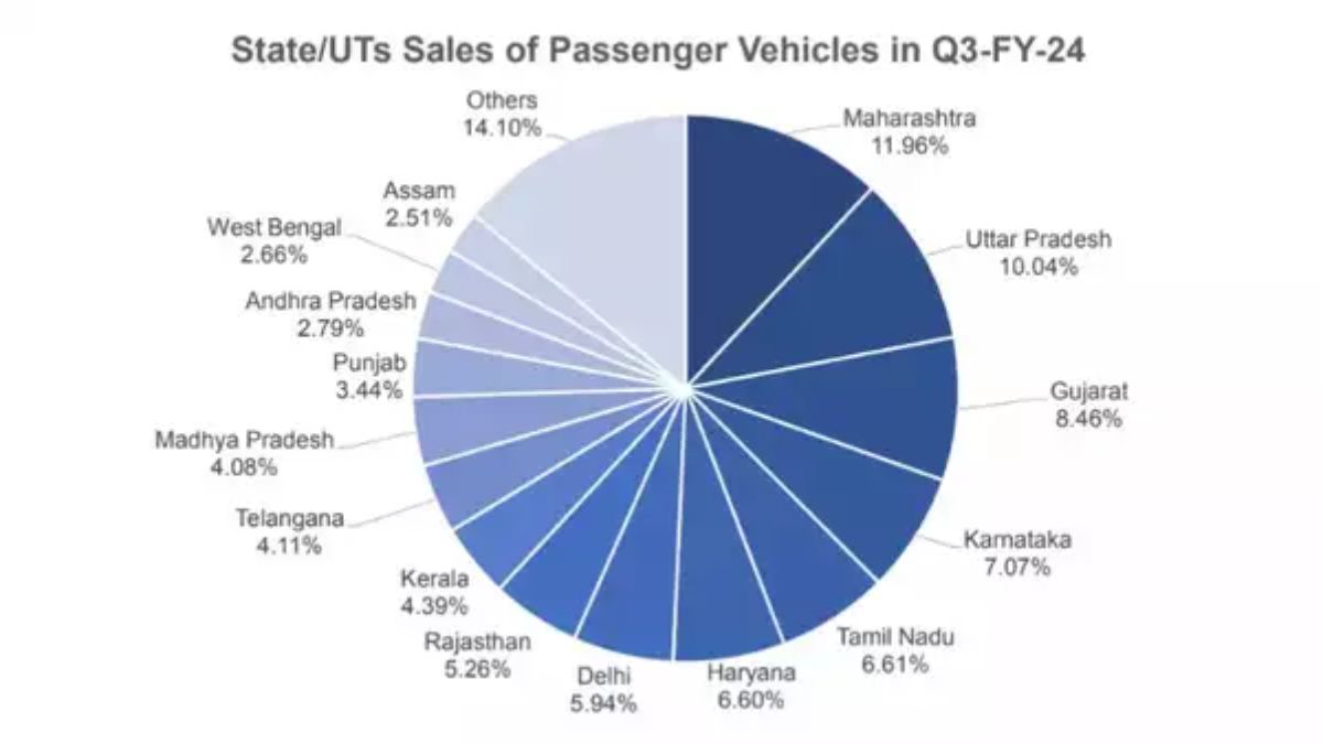 पैसेंजर व्हीकल सेगमेंट में बिक्री के मामले में महाराष्ट्र का पहला स्थान रहा है। राज्य में पीवी बिक्री का प्रतिशत 11.96 है। वहीं कार खरीदने के मामले में 10.04 प्रतिशत के साथ यूपी दूसरे स्थान पर रहा है। जबकि डेटा के मुताबिक तीसरे स्थान पर गुजरात शामिल है।