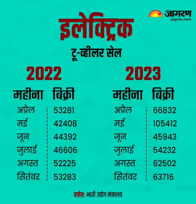 वर्ष 2022 व वर्ष 2023 के अप्रैल-सितंबर में मासिक हिसाब से इलेक्ट्रिक दोपहिया वाहनों की बिक्री कुछ इस प्रकार रही है-