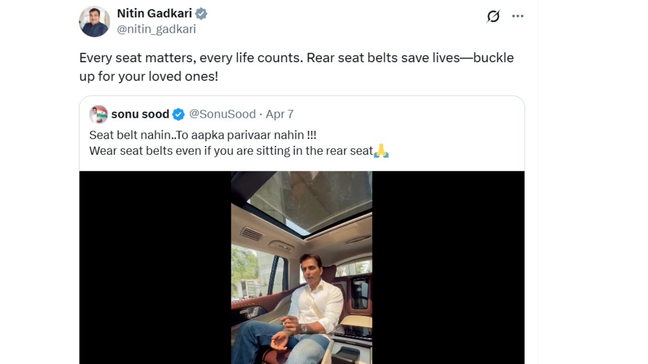 रोड सेफ्टी को लेकर पूरी जानकारी के साथ सोनू सूद के वीडियो को केंद्रीय सड़क परिवहन और राजमार्ग मंत्री नितिन गडकरी का भी साथ मिल गया है। केंद्रीय मंत्री ने सोनू सूद के वीडियो पर कमेंट करते हुए लिखा कि हर सीट मायने रखती है, हर जीवन मायने रखता है। पीछे की सीट बेल्ट जीवन बचाती है - अपने प्रियजनों के लिए सीट बेल्ट बांधें!