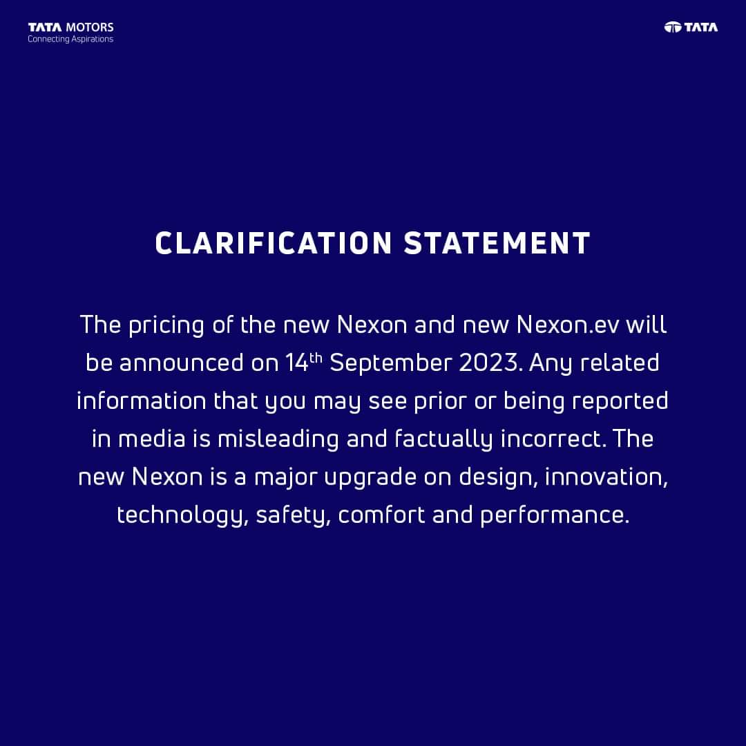 Tata Nexon facelift और Nexon EV facelift को बीते दिनों पेश किया गया था। ये दोनों ही एसयूवी कर्व कॉन्सेप्ट से प्रेरित एक नए डिजाइन के साथ आती हैं और इन्हे 14 सितंबर को लॉन्च किया जाना है। आधिकारिक लॉन्च से पहले सोशल मीडिया पर दावा किया गया है कि नई नेक्सन एसयूवी 7.39 लाख रुपये की शुरुआती कीमत पर आएगी। इसको लेकर टाटा ने स्पष्टीकरण दिया है।