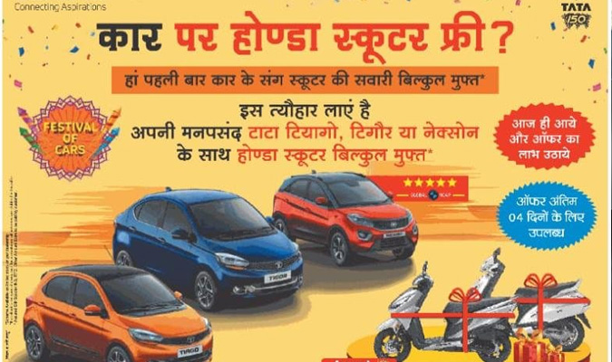 टाटा मोटर्स के मध्य प्रदेश में मौजूद एक डीलर की तरफ से कार खरीने पर फ्री स्कूटर दे रहा है।