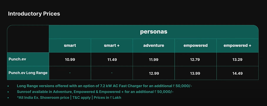 25 kWh बैटरी पैक से लैस स्टैंडर्ड Punch EV को सिंगल चार्ज पर 315 किमी की दावा की गई रेंज प्रदान करेगी। वहीं,35 kWh बैटरी पैक की विशेषता वाला Punch EV का लॉन्ग रेंज वेरिएंट 421 किमी की दावा की गई रेंज (MIDC) प्रदान करता है।