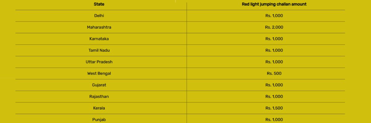 वाहन चलाते समय रेड लाइट का उल्लंघन करने वाले किसी भी व्यक्ति को स्थानीय यातायात पुलिस द्वारा तुरंत चालान जारी किया जा सकता है। चालान होने के 60 दिन के अंदर अपराधी के पास ऑनलाइन या ऑफलाइन भुगतान करने का समय होता है। भारत में रेड लाइट क्रॉस करने पर पहले जुर्माना 100 से 300 रुपये था, लेकिन मोटर वाहन अधिनियम में संशोधन के बाद इसे बढ़ाकर 1,000 रुपये कर दिया गया है। हालांकि, अलग-अलग राज्यों में ये राशि बदल जाती है। अपे राज्य का फाइन जानने के लिए नीचे दी गई तालिका देखें-