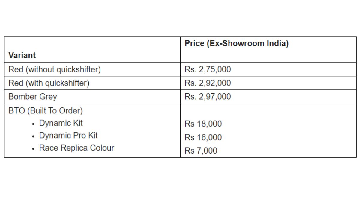 कंपनी की ओर से नई बाइक की एक्स शोरूम कीमत 2.72 लाख रुपये से शुरू किया गया है। इसके अन्य वेरिएंट्स की एक्स शोरूम कीमत 2.92 लाख रुपये तय की है। नए Bomber Gray रंग को 2.97 लाख रुपये की एक्स शोरूम कीमत पर खरीदा जा सकता है। रेस रेप्लिका कलर के लिए सात हजार रुपये अतिरिक्त देने होंगे। साथ ही डायनैमिक किट की कीमत 18 हजार रुपये और डायनैमिक प्रो किट को 16 हजार रुपये अतिरिक्त देकर खरीदा जा सकता है।