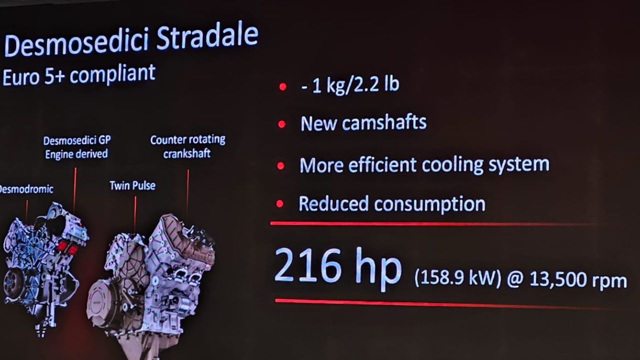 Ducati Panigale V4 बाइक में कंपनी की ओर से 1103 सीसी की क्षमता का लिक्विड कूल्ड इंजन दिया गया है। जिससे बाइक को 216 हॉर्स पावर के साथ 120 न्यूटन मीटर का टॉर्क मिलता है। बाइक में Akrapovic का एग्जॉस्ट भी ऑफर किया गया है, जिसके साथ इसकी पावर 228 हॉर्स पावर तक हो जाती है।
