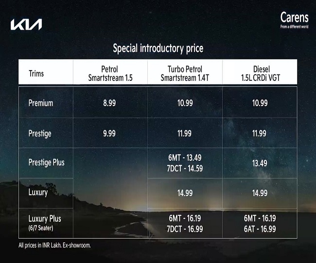 नई दिल्ली,ऑटो डेस्क। लंबे इंतजार के बाद आज यानी 15 फरवरी को Kia carens कार को इंडियन मार्केट में लॉन्च कर दिया है। कंपनी ने लॉन्चिंग इवेंट के दौरान बताया कि कीमतों की घोषणा होने के पहले तक किआ की 19,089 गाड़ियों की बुकिंग हो चुकी है। इस 7-सीटर की शुरूआती कीमत 8.99 लाख रुपये (एक्सेस-शोरूम इंडिया) से शुरू है। किआ कैरेंस को 5 वेरिएंट में लॉन्च किया गया है, जिसमें प्रीमियम, प्रेस्टीज, प्रेस्टीज प्लस, लग्जरी और लग्जरी प्लस शामिल हैं। आइये जानते हैं सभी वेरिएंट की डिटेल्स और फीचर्स।