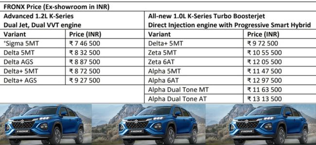 Maruti Suzuki Fronx 7.46 लाख रुपये की शुरुआती कीमत पर लॉन्च, जानिए सभी वेरिएंट की प्राइस, फीचर और खासियत