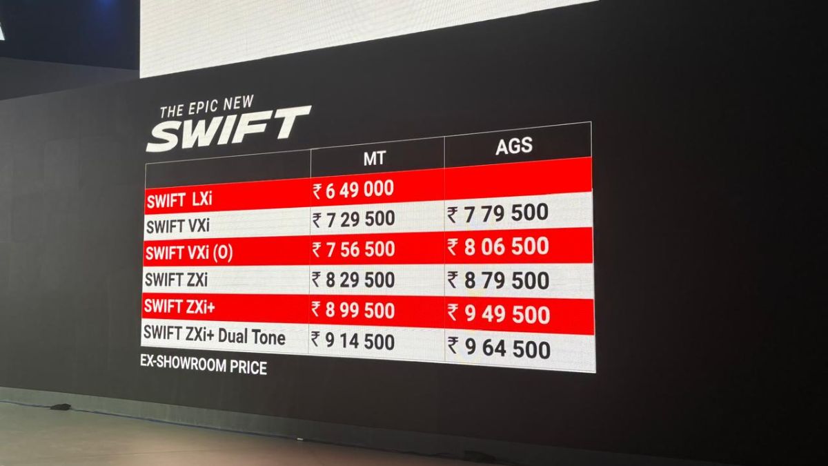 मारुति की ओर से नई स्विफ्ट 2024 को पांच वेरिएंट्स में पेश किया गया है। इसके बेस वेरिएंट की एक्स शोरूम कीमत की शुरूआत 6.49 लाख रुपये से होती है। जबकि इसके टॉप वेरिएंट की एक्स शोरूम कीमत को 9.64 लाख रुपये रखा गया है।