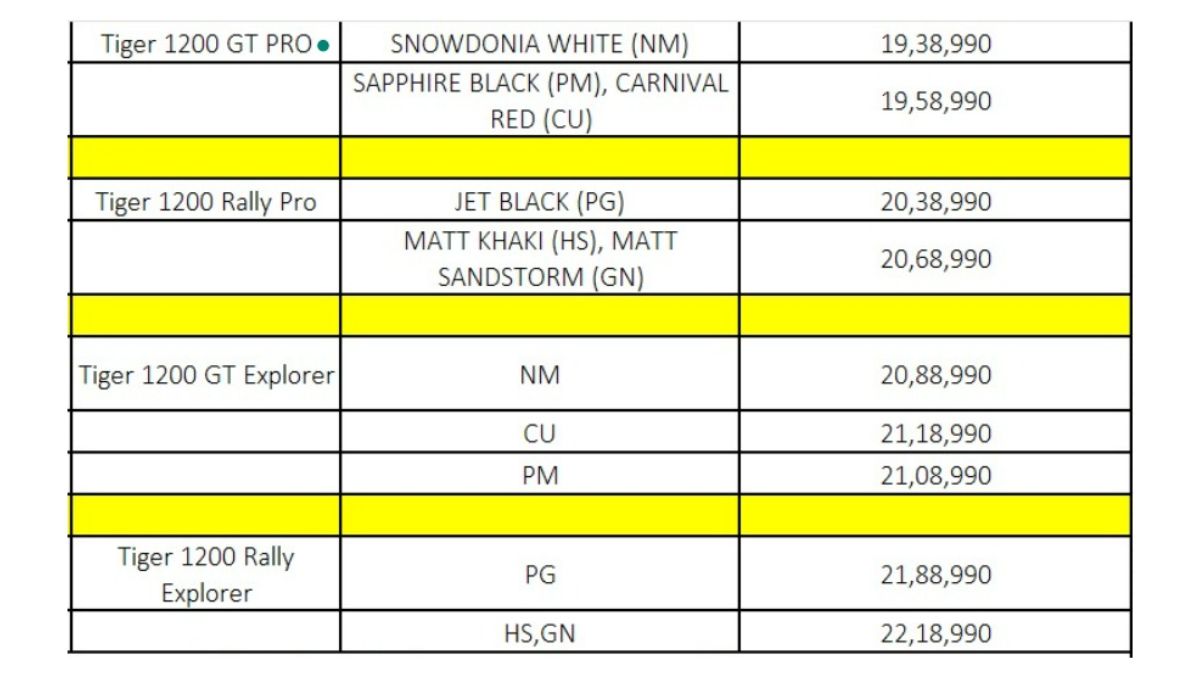 ट्रॉयम्फ की इन बाइक्स की एक्स शोरूम कीमत 19.39 लाख रुपये से शुरू हो जाती है। इनके साथ ही तीन साल की अनलिमिटेड माइलेज वारंटी को दिया जाता है।