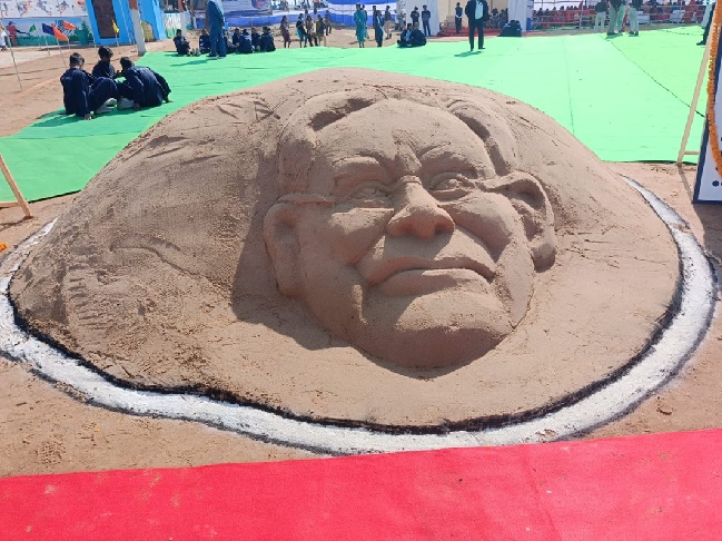 बेलखारा में कार्यक्रम स्थल पर रेत पर उकेरी गई मुख्यमंत्री नीतीश कुमार की तस्वीर।