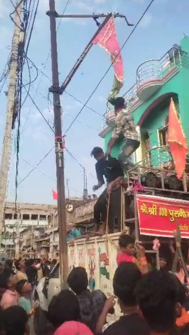 मूर्ति विसर्जन के लिए निकले जुलूस के दौरन झंडा निकलता युवक। फोटो- जागरण