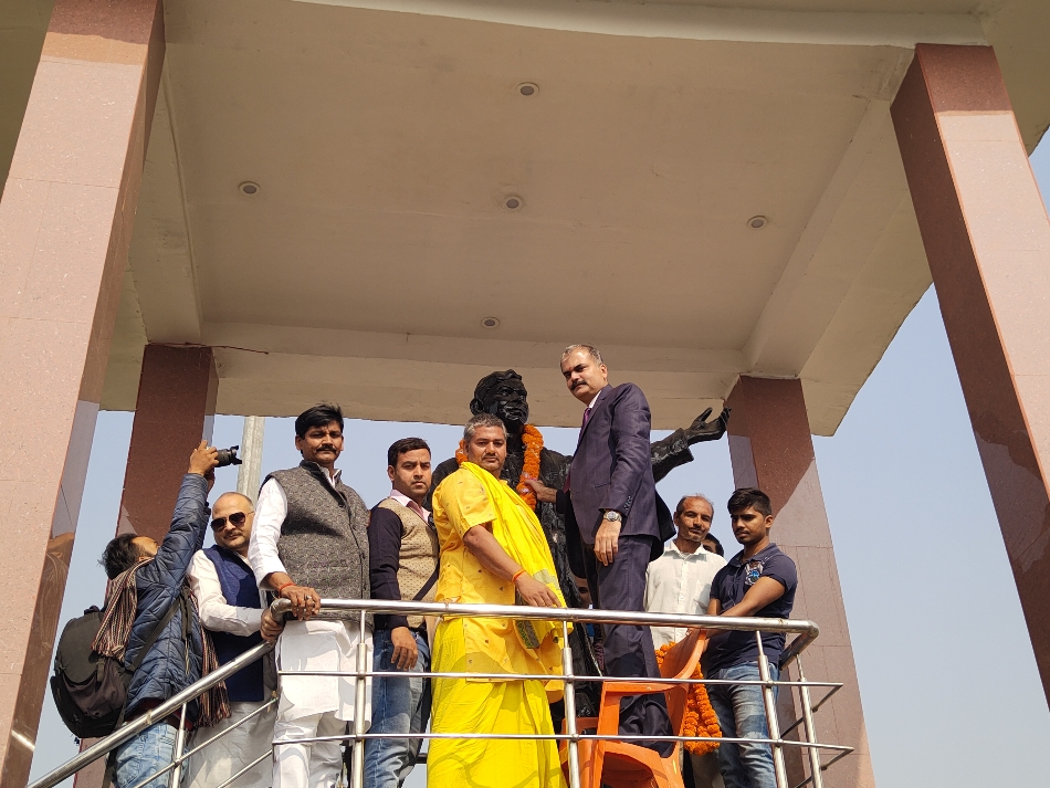 जीरोमाइल गोलंबर स्थित राष्ट्रकवि रामधारी सिंह दिनकर की आदमकद प्रतिमा पर माल्यार्पण करते सीनियर आईपीएस विकास वैभव