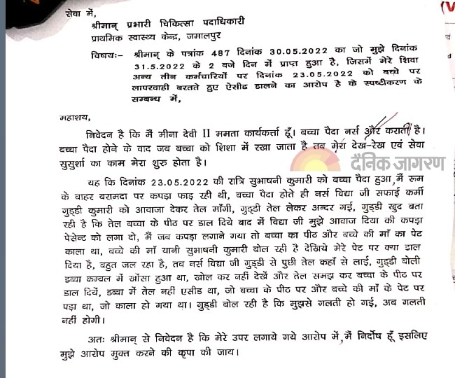 दरसअल, 23 मई को जमालपुर थाना क्षेत्र के बड़ी दरियापुर की रहने वाली महिला सुभाषिनी देवी को प्रसव पीड़ा होने पर प्राथमिक स्वास्थ्य केंद्र जमालपुर में स्वजनों ने भर्ती कराया। ड्यूटी पर तैनात एएनएम विद्या कुमारी और संतोषी देवी की देखरेख में महिला ने बच्ची को जन्म दिया। इसके बाद एएनएम ने महिला के पेट और नवजात के पीठ पर तेल के बदले एसिड से मालिश कर दिया। कुछ देर बाद दोनों का शरीर जलने लगा। त्वचा का कलर बदलने लगा। मामला बिगड़ता देख आनन-फानन में सदर अस्पताल भेज दिया गया।