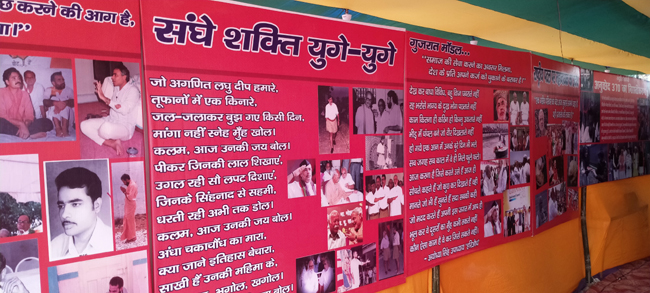 नीरज कुमार, कटिहार। कटिहार शहर के टाउन हाल में चल रहे भाजपा के दो दिवसीय प्रदेश कार्यसमिति की बैठक में प्रधानमंत्री के आरएसएस के प्रचारक जीवन से संबंधित तस्वीर भी लगाई गई। प्रधानमंत्री के संघ (RSS) गणवेश में प्रार्थना करने, वर्तमान एवं पूर्व सरसंघचालकों के साथ बातचीत करने के चित्रों को भी प्रस्तुत किया गया। इसी प्रदर्शनी में संघे शक्ति युगे-युगे भी लिखा हुआ है। गुजरात मॉडल का भी जिक्र है।