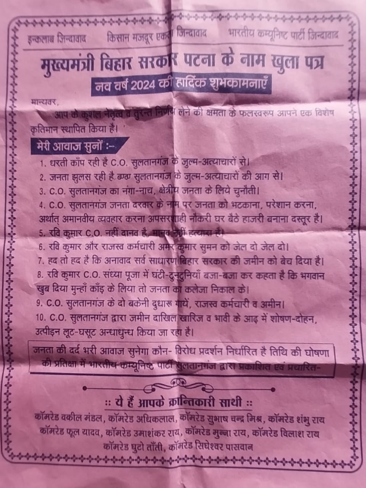 Open Letter To CM Nitish: सुल्तानगंज CO के खिलाफ कम्युनिस्ट पार्टी ने खोला मोर्चा, घर-घर पर्चे बांट रहे कार्यकर्ता