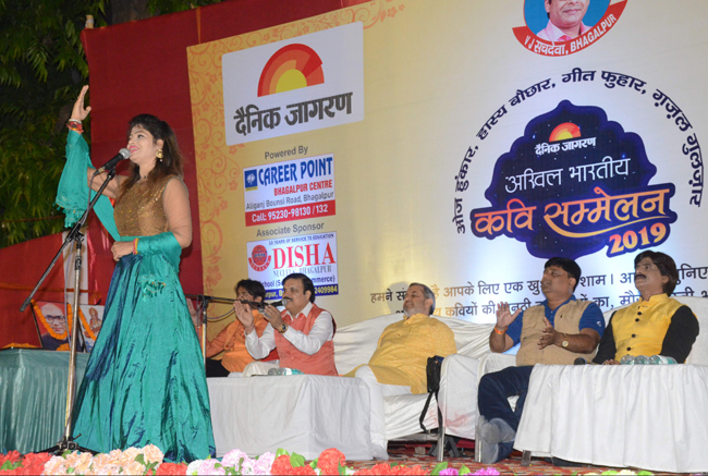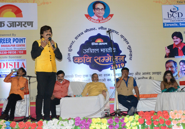 दैनिक जागरण की ओर से मारवाड़ी पाठशाला में आयोजित अखिल भारतीय कवि सम्मेलन में शहरवासी देर रात तक कविताओं का रसपान करते रहे। कवि सम्मेलन का उद्घाटन प्रधान न्यायाधीश ब्रजेश कुमार पांडेय, जिला एवं सत्र न्यायाधीश अष्टम एमपी सिंह, महापौर सीमा साहा, बीएयू के प्रसार निदेशक आरके सोहाने, पूर्व महापौर डॉ. वीणा यादव, दैनिक जागरण भागलपुर के महाप्रबंधक राजाराम तिवारी और संपादकीय प्रभारी संयम कुमार ने संयुक्त रूप से किया। इस मौके पर प्रधान न्यायाधीश ब्रजेश कुमार पांडेय ने कहा कि कवि सम्मेलन एक ऐसा मंच है जहां लोग जिंदगी जीते हैं। तनाव की वजह से लोग हंसना भूल गए हैं। कवि सम्मेलन में लोगों को जमकर हंसने का मौका मिलता है। उन्होंने कहा कि मानव होना सौभाग्य है तो कवि होना परम सौभाग्य है। कवि सम्मेलनों में आने वाले लोग भाग्यशाली होते हैं। कवि सम्मेलन के आयोजन पर उन्होंने दैनिक जागरण को धन्यवाद दिया। उन्होंने कहा कि 1970 के बाद कवियों के व्यंग्य की धारा नेताओं की तरफ हो गई। उन्होंने अपनी व्यंग्यपूर्ण वाणी से कई बार श्रोताओं को हंसाया।
