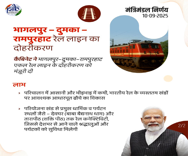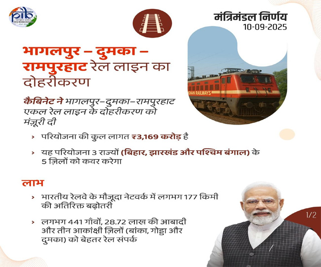 कैबिनेट ने 3,169 करोड़ रुपये की लागत से 177 किलोमीटर लंबी भागलपुर-दुमका-रामपुरहाट सिंगल रेलवे लाइन के दोहरीकरण को मंजूरी दी है। इस परियोजना के तहत परिचालन में आसानी होगी, भीड़भाड़ कम होगी और 15 मिलियन टन अतिरिक्त माल ढुलाई संभव होगी। यह परियोजना बिहार के बांका के साथ झारखंड के गोड्डा और दुमका जैसे आकांक्षी जिलों को सीधा लाभ पहुंचाएगी। इसके अलावा, देवघर (बाबा बैद्यनाथ धाम) और तारापीठ जैसे धार्मिक स्थलों के साथ-साथ 441 गांवों और लगभग 29 लाख की आबादी को बेहतर रेल संपर्क मिलेगा। कोयला, सीमेंट, उर्वरक, ईंट और पत्थर जैसी वस्तुओं की ढुलाई के लिए यह मार्ग रणनीतिक रूप से महत्वपूर्ण है। पर्यावरणीय दृष्टि से भी यह परियोजना लाभकारी होगी, क्योंकि इससे पांच करोड़ लीटर ईंधन की बचत और 24 करोड़ किलोग्राम कार्बन उत्सर्जन में कमी आएगी।