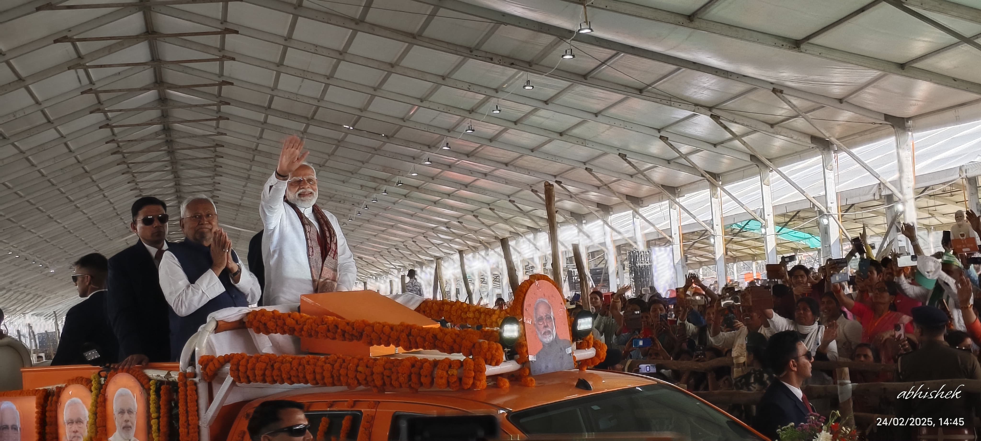 भागलपुर में प्रधानमंत्री नरेंद्र मोदी खुली जिप से सभा स्थल पर पहुंचे। उनके साथ मुख्यमंत्री नीतीश कुमार भी हाथ जोड़े कुछ इस अंदाज में नजर आए।#Bihar #BiharPolitics #PMModi #Bhagalpur #PMKisan #NitishKumar pic.twitter.com/BiqnAcjvx3