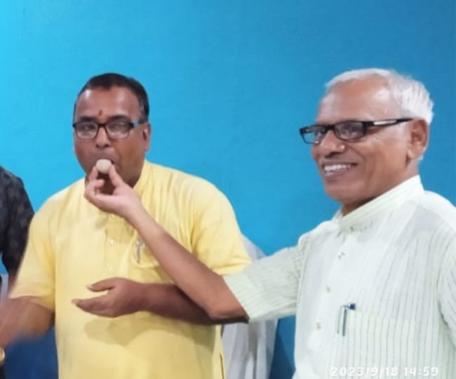 सैनिक स्कूल की मान्यता मिलने की खुशी में एक-दूसरे लड्डू खिलाते प्रधानाचार्य और अध्यक्ष।