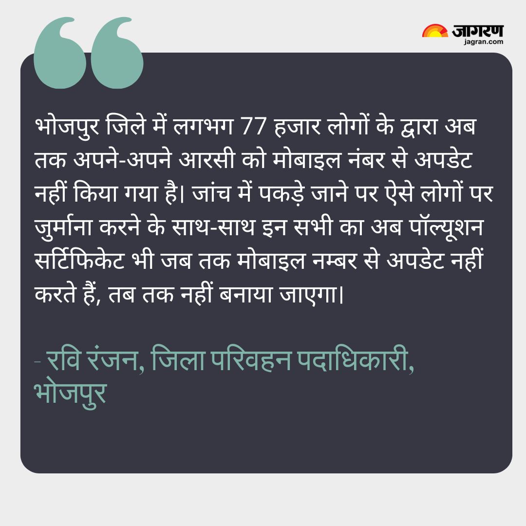 धर्मेन्द्र कुमार सिंह, आरा। बिहार में वाहन मालिक और चालक की लापरवाही के कारण अब तक 24 लाख से ज्यादा रजिस्ट्रेशन सर्टिफिकेट (आरसी) मोबाइल नंबर से अपडेट नहीं हो पाए हैं। अब इस लापरवाही का नतीजा इन सभी को भुगतना पड़ेगा। परिवहन विभाग, जिनका मोबाइल नंबर से आरसी अपडेट नहीं है, वैसे वाहनों का पॉल्यूशन सर्टिफिकेट नहीं देने के साथ इन सभी पर जुर्माना करने की भी तैयारी में लगा है।